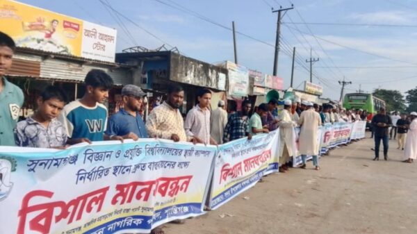 সুনামগঞ্জ বিজ্ঞান ও প্রযুক্তি বিশ্ববিদ্যালয়ের স্থায়ী ক্যাম্পাস বাস্তবায়নের দাবিতে বিশাল মানববন্ধন