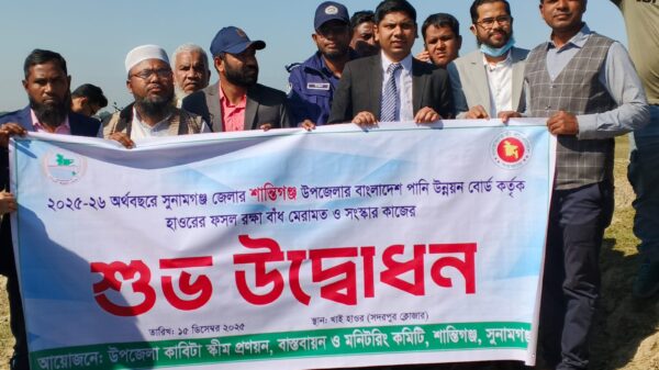 শান্তিগঞ্জে হাওরে বেড়ি বাঁধ নির্মাণ ও সংস্কার কাজে উদ্বোধনেই সীমাবদ্ধ : নির্ধারিত সময়ের ২০ দিন পেরিয়ে গেলেও শুরু হয়নি বাঁধের কাজ